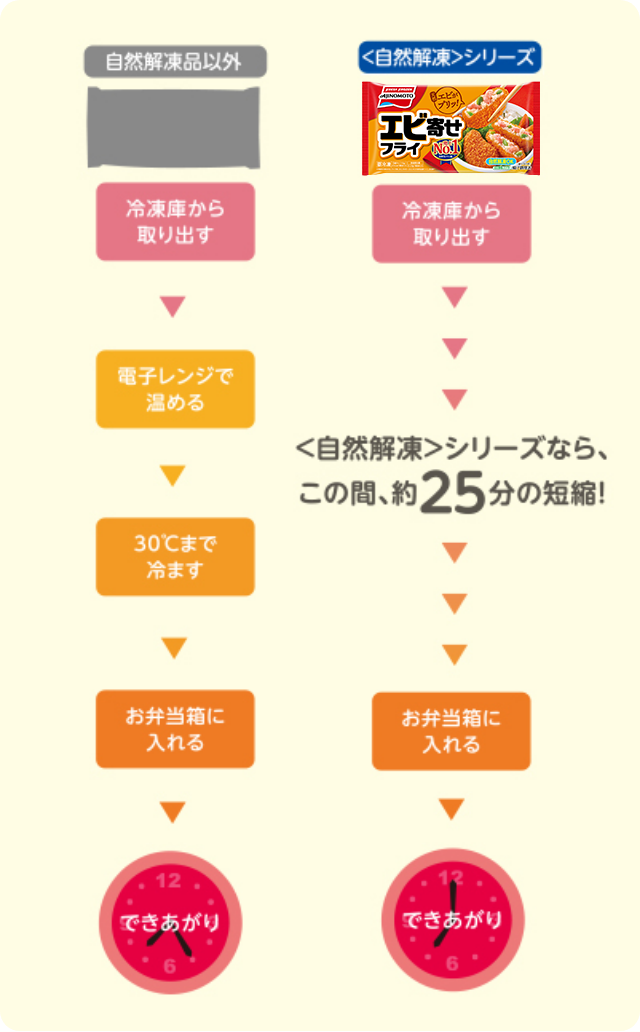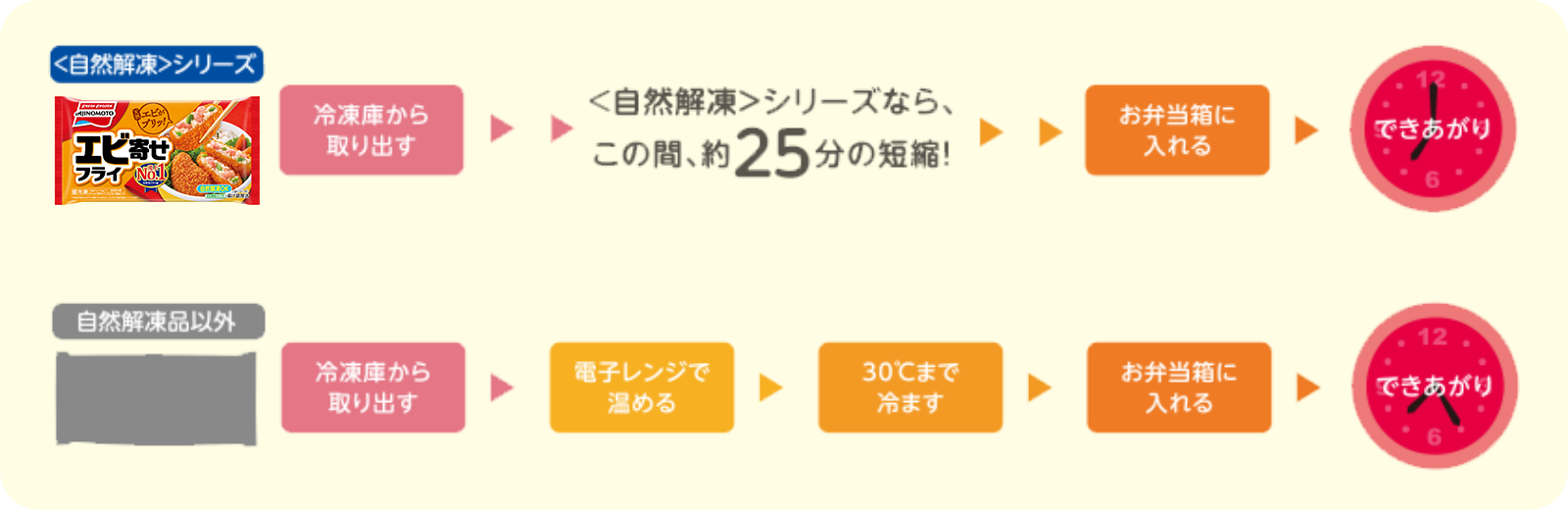 ※1:約25分=通常商品をレンジ調理する時間+商品を弁当に入れる適温(30℃)まで冷ますと、自然解凍でそのまま弁当箱に入れる時間の差(当社調べ)